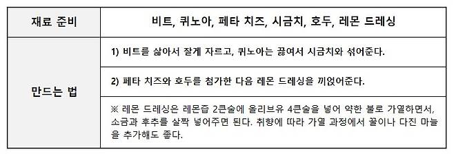 항산화 성분과 비타민이 풍부한 건강 식재료 비트와 식물성이면서 완전 단백질의 대표 주자인 퀴노아로 포만감을 높이는 메뉴다. 여기에 페타 치즈와 호두로 불포화 지방을 추가해 완성도를 더했다. 비트 대신 당근이나 호박을 쓸 수 있고, 페타 치즈는 모짜렐라 치즈로 대체할 수 있다.