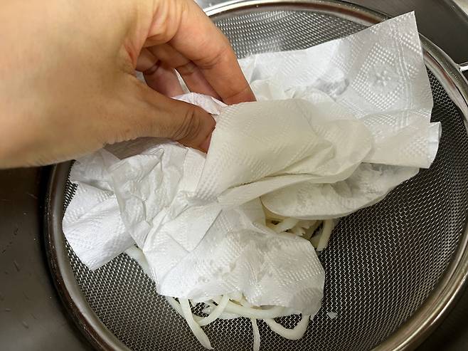 뜨거운 물에 헹군 진미채는 물기를 제거한 뒤 조리하세요. 키친타월로 톡톡 눌러가며 수분을 가볍게 제거해 줍니다.