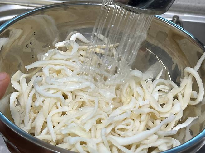 대신 진미채는 채에 받쳐 가루를 털어 내고, 뜨거운 물을 천천히 부어서 세척합니다.