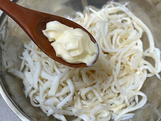 마요네즈를 넣으면 질긴 식감을 부드럽고 촉촉하게 만들어 줍니다. 또한 마요네즈가 진미채의 짠맛을 중화시켜 맛이 한층 부드러워집니다.