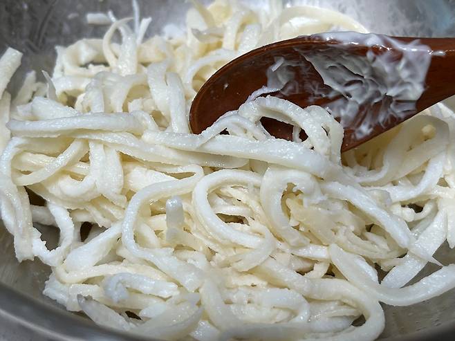 뜨거운 물에 데치고, 마요네즈를 코팅한 진미채는 냉장고에 며칠 넣어 보관해도 촉촉하고 부드러움이 유지됩니다.