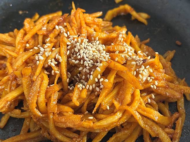 마요네즈에 골고루 버무린 진미채를 양념에 볶아서 진미채볶음을 만들어 보세요. 이렇게 하면 고소한 맛도 살아나고 식감도 부드럽습니다.