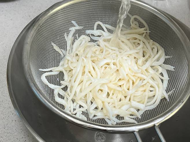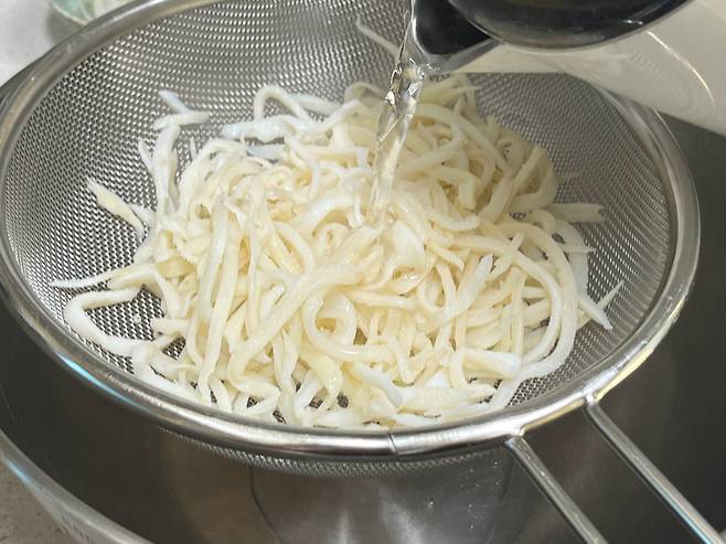 대신 진미채는 채에 받쳐 가루를 털어 내고, 뜨거운 물을 천천히 부어서 세척합니다.