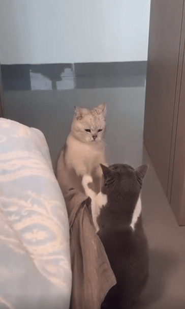 잔잔한 오후, 침대 옆 바닥에서 두 마리 고양이가 마주 앉아 있습니다. 서로 눈을 맞추며 살짝 긴장한 듯, 하지만 당장 달려들 것 같진 않은 분위기. 그러더니 한 고양이가 천천히 앞발을 들어 상대방의 앞발을 툭— 가볍게 건드립니다. 맞은 고양이는 잠깐 멈췄다가, 마치 기다렸다는 듯 자신도 앞발을 들고 상대방의 앞발을 툭 치며 반격. 두 고양이 사이엔 마치 앞발로 하는 가위바위보처럼, 절도 있는 '툭툭 배틀'이 이어집니다.