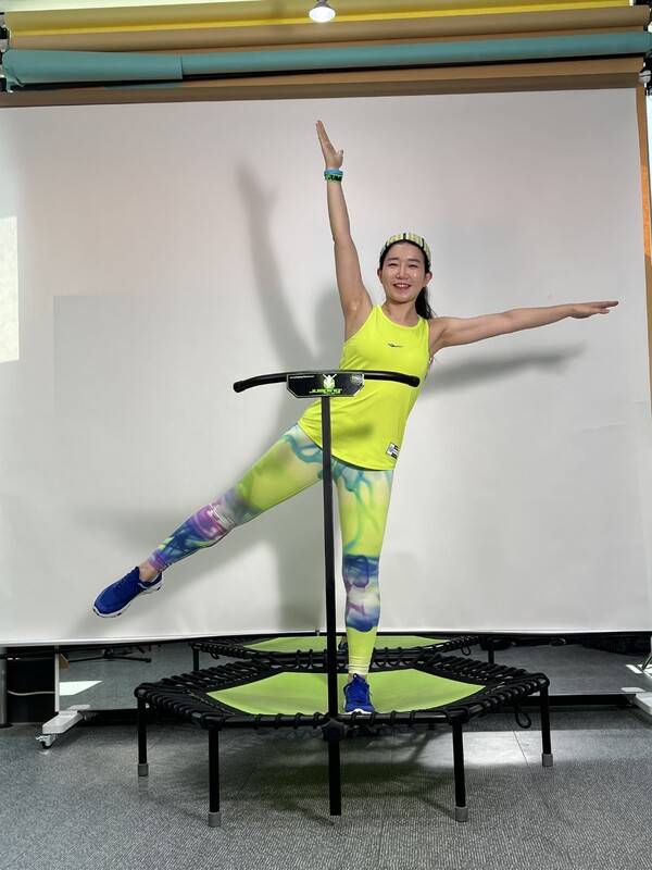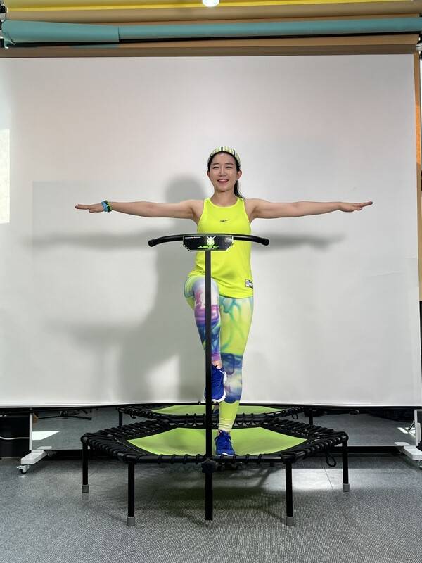 게다가 균형을 잡으면서 한 자리만 밟아 운동을 해야 하는데 아이들과 초보자는 여러 군데 밟는 경향이 있어요. 몸 전체가 높이 뛰는 게 아니라 배에 힘주고 무릎을 사용해 다리 위주로 점프하는 게 요령이에요. 트램폴린 매트가 탄력이 좋아요. 노는 것처럼 그저 트램폴린에 몸을 맡겨 그냥 통통 튕기는 게 아니라서 균형을 잡을려면 코어에 힘이 많이 들어가요. 제가 독일에서 자격증을 따고 다시 한국에 와서 체코에서 보내준 트램폴린을 받기 전까지는 어쩔 수 없이 쇠용수철로 된 원형트램폴린에서 연습했는데 잘 뛰어지지도 않고 삐그덕거렸죠. 체코 본사가 기술을 발휘해 배 힘으로 잘만 누르면 되는 기구가 된 거에요.