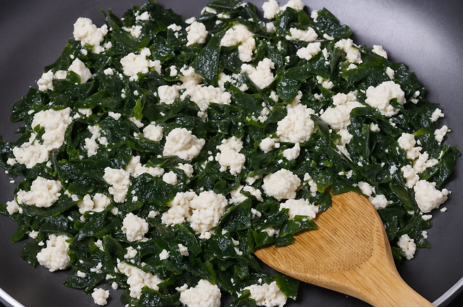 두부는 키친타월로 물기를 제거한 뒤, 포크나 손으로 곱게 으깨어 준비합니다.