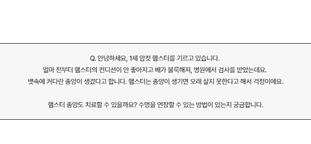 A. 안녕하세요. 2000년부터 23년째 특수동물(exotic animal) 진료를 전문적으로 보고 있는 아크리스동물의료센터 대표 원장 박천식 수의사입니다. 이번에는 햄스터 몸에 종양이 생겼다는 사연이네요. 종양은 햄스터에게 꽤 흔하게 발생하는데요. 햄스터에게 종양이 생기면 어떻게 해야 하는지 자세히 알아보도록 하겠습니다.