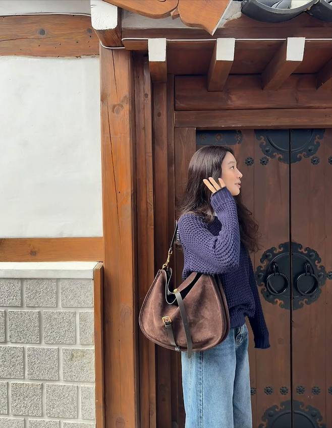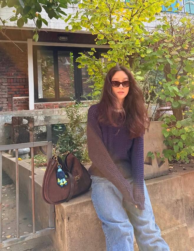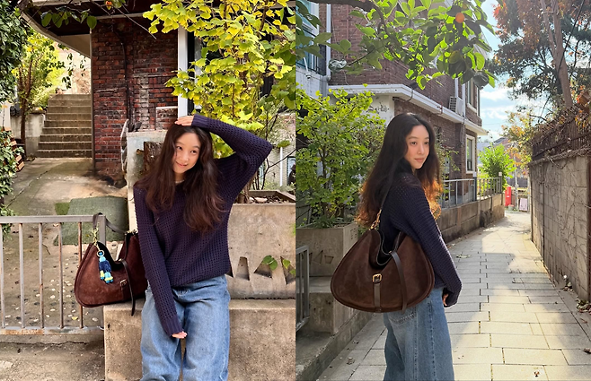 그녀가 공개한 사진 속 패션은 ‘꾸안꾸’의 정석 그 자체로 완벽했습니다. 그녀는 짙은 네이비 컬러의 성근 짜임 니트에 넉넉한 핏의 와이드 데님 팬츠를 매치했습니다.