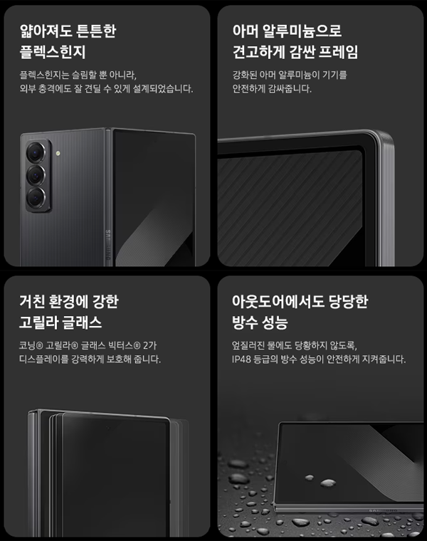 갤럭시 Z 폴드6보다 더 얇고 가벼워졌지만 배터리 용량은 동일한 4,400mAh이며 플렉스 힌지 구조와 강화된 아머 알루미늄, 코닝 고릴라 글래스 빅투스2, 그리고 IP48 등급 방수 성능 등 내구성 특징도 동일하다.