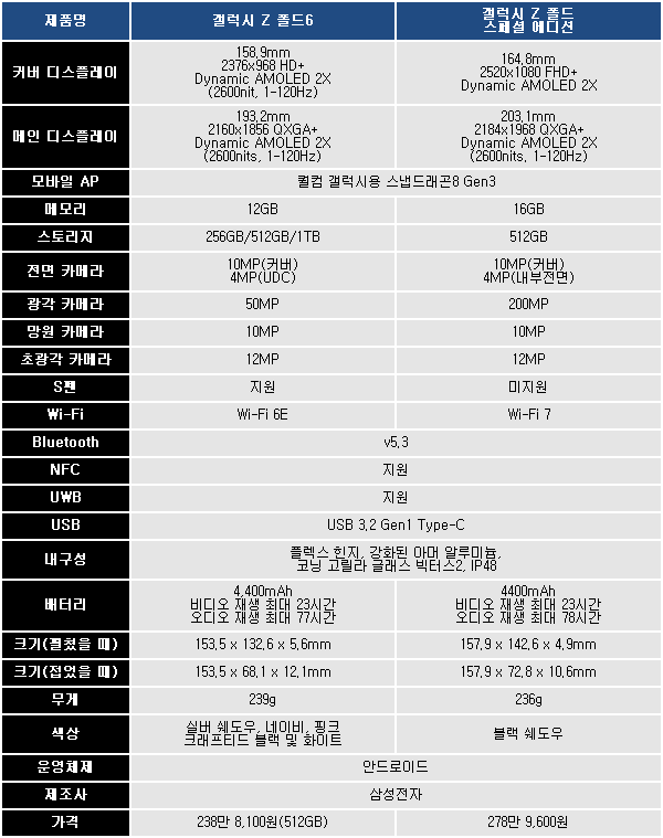 특히 갤럭시 Z 폴드6에 탑재된 메모리(12GB)보다 늘어난 16GB 메모리를 통해 폴더블에 최적화된 '갤럭시 AI' 사용 경험을 제공하며, 스토리지는 512GB 단일 용량으로 구성된다.