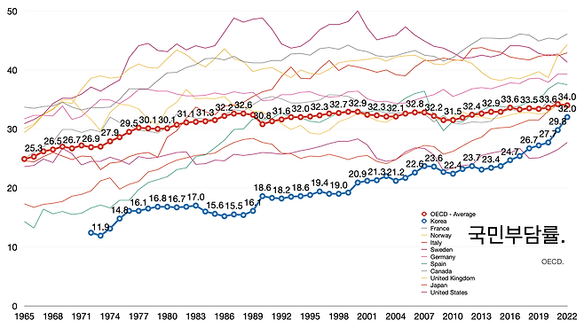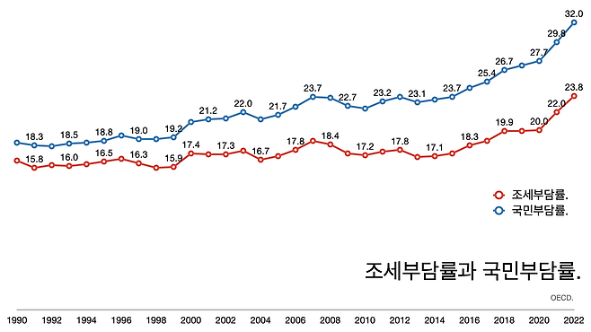 - 어제 슬로우레터를 보고 문의주신 분들이 있어서 조세부담률(Total tax revenue excluding social security as percentage of GDP)과 국민부담률(Total tax revenue as percentage of GDP)을 비교해 봤습니다.