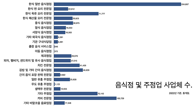 - 커피 전문점 수가 10만 개가 넘었다는 소식 전해 드렸죠. 종사자 수도 뽑아봤습니다. 27만 명 정도가 종사하고 있군요. 전체 요식업 종사자는 204만 명. 매출은 177조 원입니다. 1인당 매출은 전체 평균 8679만 원인데 커피 전문점만 놓고 보면 5703만 원입니다.