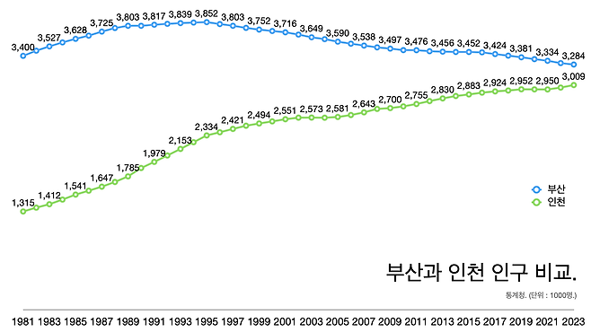 - 지난해 말 기준으로 부산 인구는 328만 명. 인천 인구가 301만 명이라 곧 따라잡힐 거라는 전망도 나온다.
