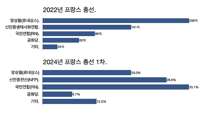 - 지난달 유럽연합 선거에서 극우 성향의 국민연합(RN)이 1위를 하자 에마뉘엘 마크롱(프랑스 대통령)이 “이대로 넘어갈 수는 없다”면서 의회를 해산하고 조기 총선을 밀어붙인 결과다.