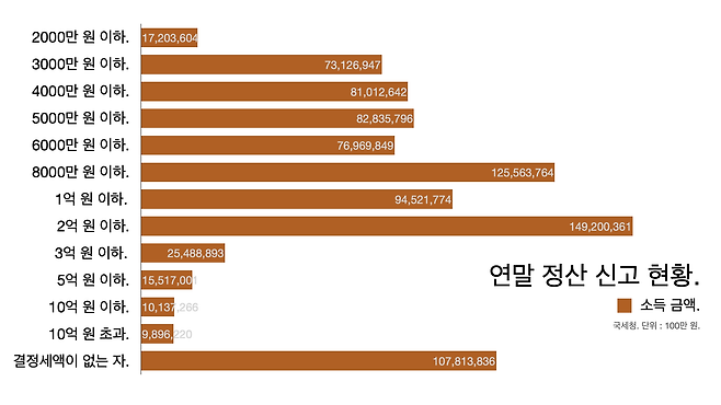 - 한국이 소득세 면세 구간이 많은 건 사실입니다. 아래 그림은 2022년 연말 정산 기준으로 소득 분위별 납세자 수를 비교한 결과입니다. ‘결정세액이 없는 자’가 연말 정산 이후 세금을 돌려 받아 결과적으로 한 푼도 내지 않는 사람들입니다. 전체 근로소득자 2053만 명 가운데 면세자가 34%입니다.