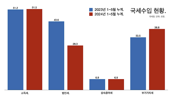 - 어제 본문에 들어간 국세 수입 현황은 2023년과 2024년 1월~5월 누적 집계를 비교한 것입니다. 범례가 빠져서 다시 첨부합니다.
