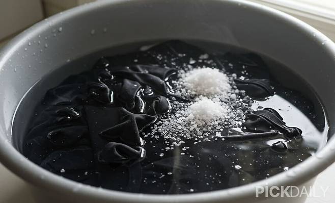 소금은 소금으로 제거! 검은 옷에 하얗게 남은 땀 얼룩은 소금물을 활용해 쉽게 지울 수 있다. 물 500ml에 소금 한 스푼을 녹인 뒤, 얼룩 부위에 적셔서 10분 정도 두었다가 부드러운 칫솔이나 손가락으로 살살 문질러 준다.