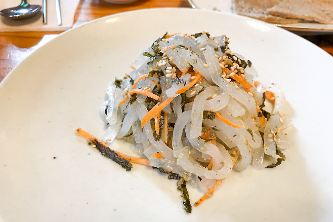 반찬도 아주 정갈하다. 너무 과하지 않고, 슴슴하면서도 맛깔난 반찬들이 줄을 선다. 일단 보리굴비가 나왔는데 적당한 숙성도에 잘 쪄낸 느낌이다. 쫄깃함이 탁월해서 먹기가 좋다. 살을 찢어보면 탄력이 있어야 개인적으로는 높은 점수를 줄 수 있다. 이유는 녹차물에 말아 놓은 밥이 부드러워 그것과 함께 입에 들어가 쫄깃함으로 맛을 높여주니 입이 즐겁기 때문이다.