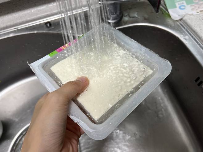1. 먼저 두부에 들어 있는 충전수를 비워줍니다.