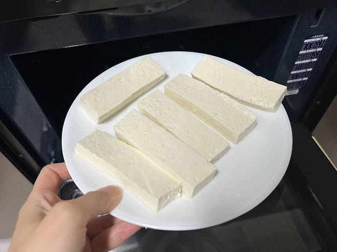두부를 굽기 전 전자레인지 3분만 돌려주면 두부에 있던 수분을 증발시키는 효과가 있습니다.