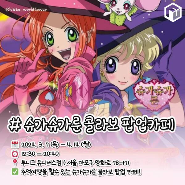 투니버스 키즈의 추억여행! 슈가슈가룬 콜라보 카페가 합정 투니크에 열렸습니다. 입구부터 반겨주는 쇼콜라, 바닐라와 함께 온 사방이 슈가슈가룬 컨셉으로 꾸며져 있는 슈가슈가룬 카페는 다양한 포토존이 있어 사진 찍기에도 좋은데요.