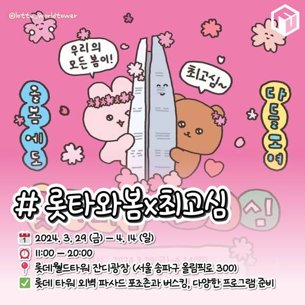 잠실 롯데월드타워가 일러스트레이터 최고심과 함께 롯타와봄 행사를 진행합니다. 봄을 맞이해 진행하는 이번 롯타와봄x최고심 행사에는 최고심 대형 부적과 각종 포토존, 버스킹 등의 다양한 프로그램이 진행됩니다.