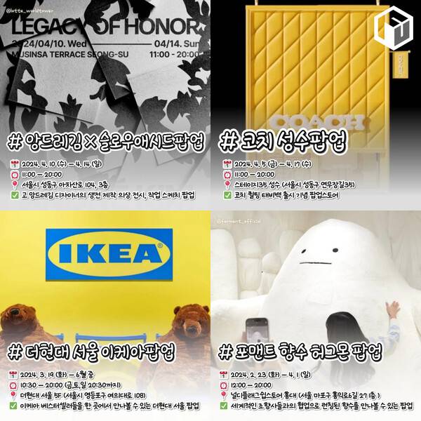 또 <코치(coach) 성수 팝업>에서는 코치 2024 봄 컬렉션과 메인 아이템인 퀼팅 태비백을 만날 수 있습니다. 마지막으로는 홍대 핫플로 떠오른 <코튼 허그몬 하우스>가 많은 사랑을 받아 4월 14일까지 연장되어 포맨트 향수 허그몬 팝업스토어를 즐기실 수 있으십니다.