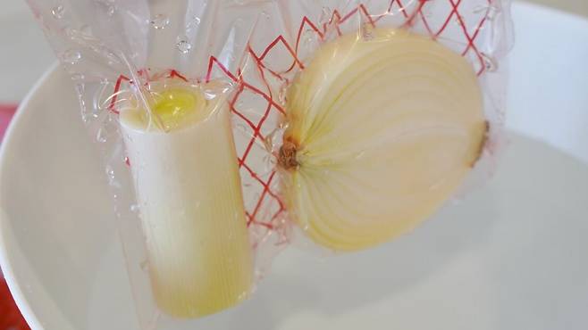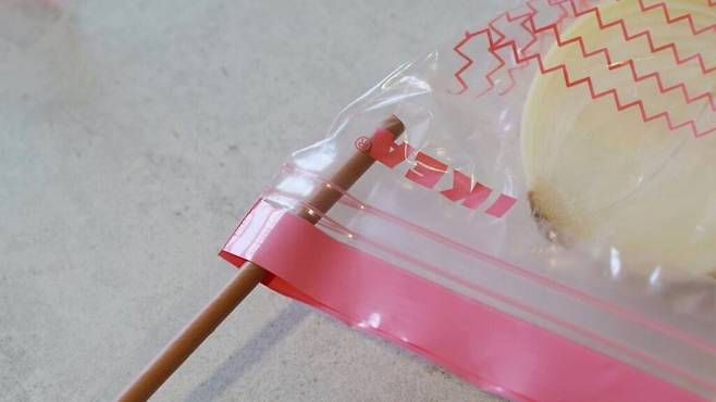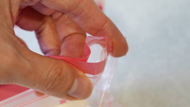 이제 큰 대야에 물을 충분히 받아 지퍼백을 물 속에 천천히 넣어줍니다. 이때 물이 지퍼백 안으로 들어가지 않도록 주의하세요! 물의 압력이 지퍼백 안의 공기를 자연스럽게 밀어내면서 진공상태가 되는데요, 마지막 남은 지퍼를 재빨리 닫으면 완성입니다.
