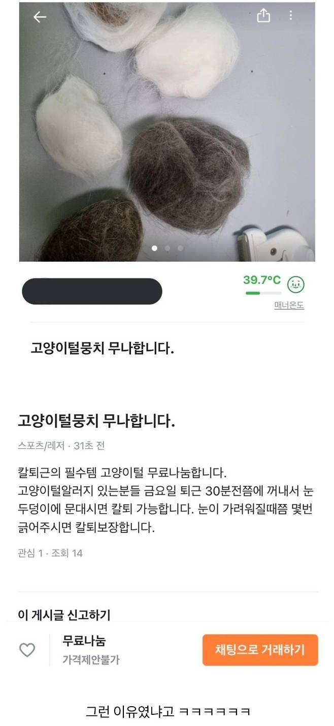 당근마켓에서 어느 판매자가 무료 나눔 하는 상품