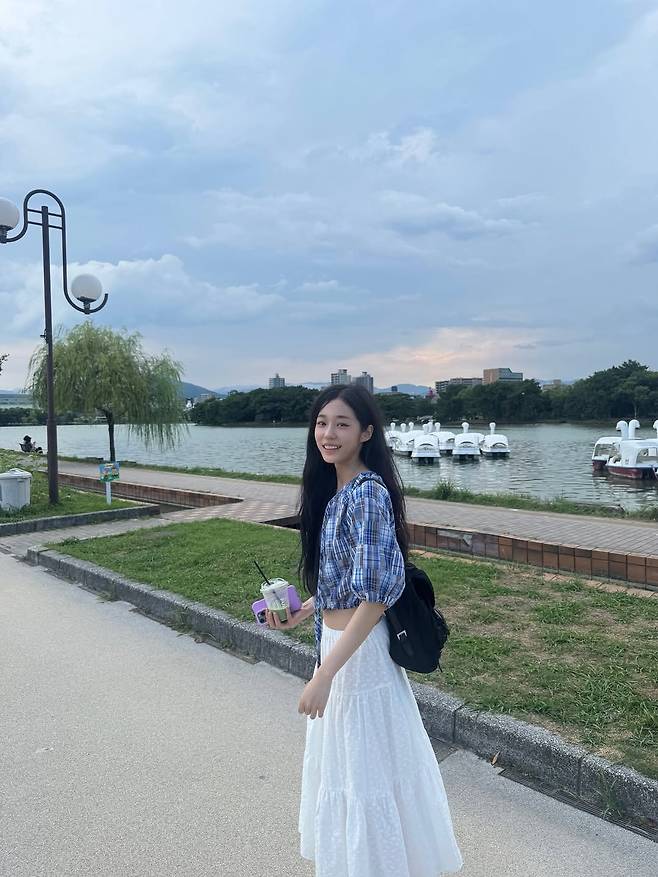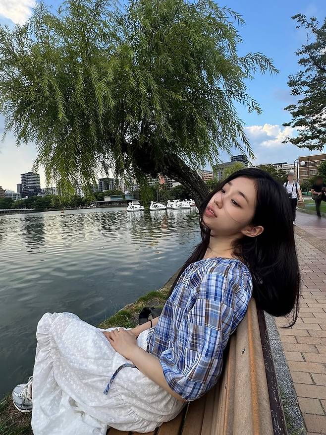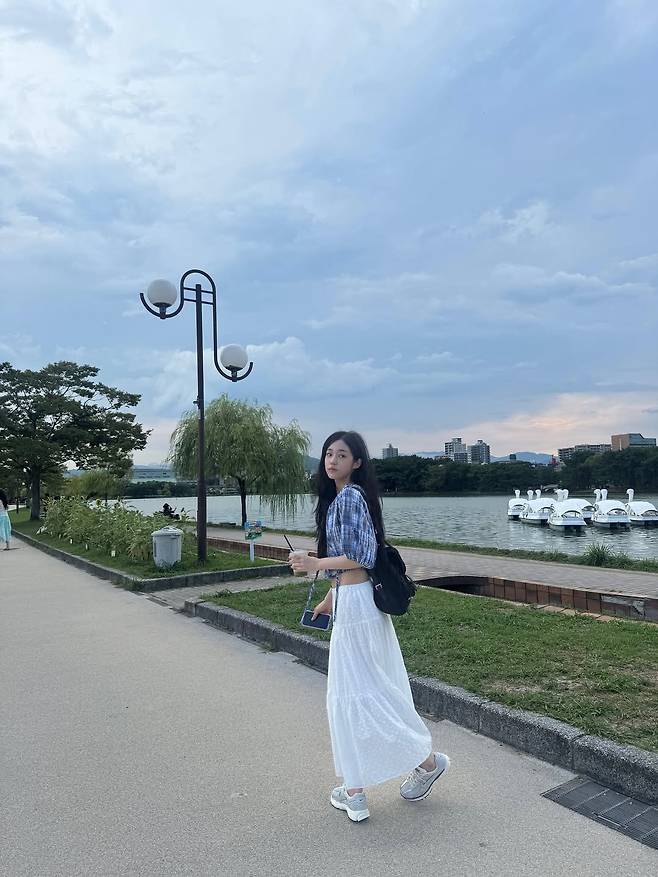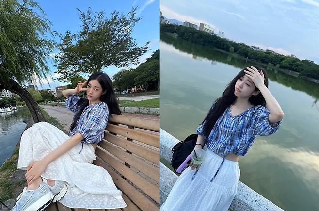 여기에 순백의 롱스커트를 매치해 그녀의 청순한 매력을 한층 더 극대화하고 있는 모습이다. 벤치에 기대앉아 강을 바라보는 그녀의 26살 풋풋한 비주얼은 감탄을 자아내고 있다.
