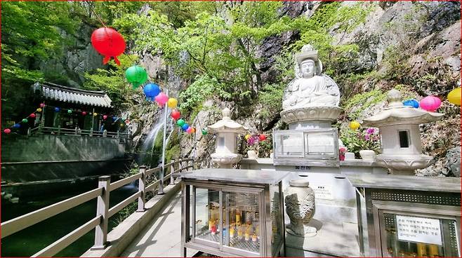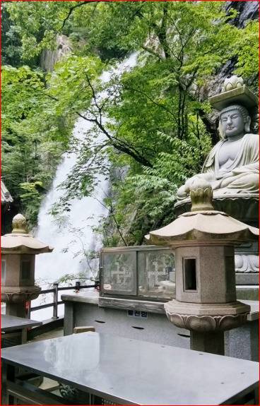 폭포 아래에는 아담한 사찰 홍룡사가 조용히 자리를 지키고 있어, 풍경에 신비로움까지 더해집니다.이 사찰은 이름 그대로 홍룡폭포의 정기를 받아 자리한 곳으로, 예로부터 이 일대 수행자들에게 마음을 다스리는 공간이 되어 왔습니다.사찰 경내에 앉아 폭포 소리를 들으며 잠시 명상에 잠기면, 마치 시간도 함께 멈춘 듯한 평온함이 찾아옵니다.
