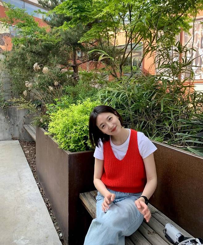 베이식한 화이트 티셔츠에 손뜨개 느낌의 레드 니트 베스트를 레이어드해 포인트를 주었고, 여유 있는 라이트 데님 팬츠로 전체적인 스타일을 자연스럽게 마무리했습니다.