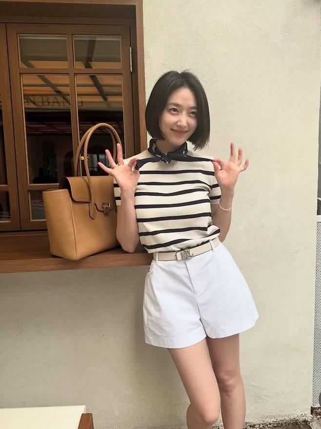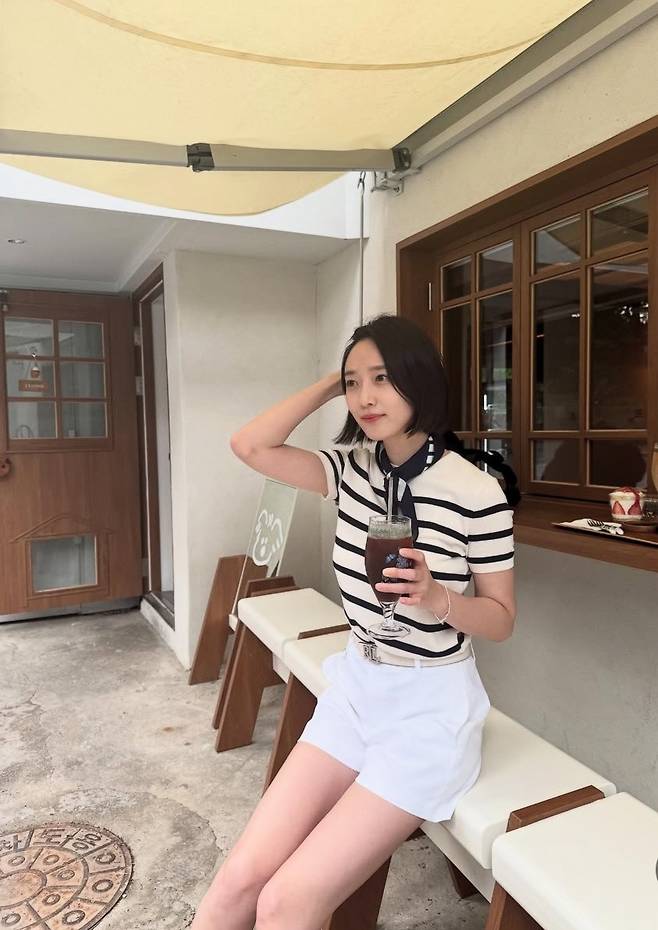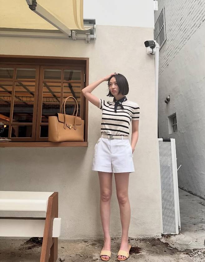 스트라이프 니트 톱과 화이트 쇼츠의 조합으로 시원하고 세련된 스타일을 구현했으며, 목에 살짝 묶은 스카프 디테일이 룩의 완성도를 높였습니다.
