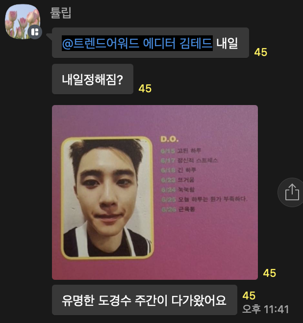 이번 주부터 유명한 도경수 주간이 다가왔다고 다뤄달라고 했다.