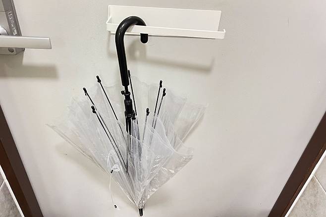 우산 사용 후 현관문에 그냥 세워두면 쓰러지기 일쑤였는데요. 이렇게 걸어두면 쓰러질 염려도 없고 물기도 잘 빠집니다. 비 오고 난 뒤 젖은 슬리퍼 말리기에도 딱이네요.