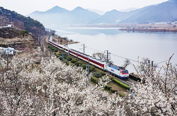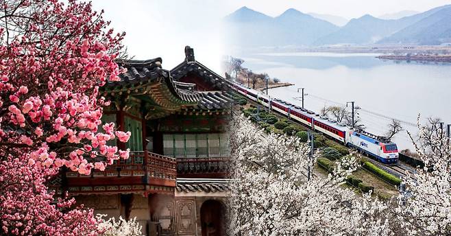 낙동강을 따라 펼쳐진 매화꽃 군락이 장관으로 알려져 있는 원동 순매원입니다. 매년 3월 순매원의 전망대에서는 만발한 매화가 액자를 이루고, 그 사이에 낙동강과 경부선 철길이 어우러져 동화 속 한 장면을 연상케하는 풍경을 감상할 수 있는데요. 철길을 따라 기차가 지나는 순간이 특히 아름답습니다.