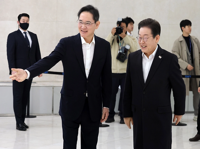 일례로 20일 이 대표가 대한민국 대표 기업이자 국민기업으로 불리는 삼성전자 이재용 회장과 비공개 회동을 가진 이후 삼성전자 주식이 장중 한때 6만원을 돌파하기도 했다. 이 대표는 이날 진행된 간담회에서 “기업이 잘돼야 나라가 잘되고 삼성이 잘 살아야 삼성에 투자한 사람도 잘 산다”며 “글로벌 경쟁이 격화된 세상이라 대기업들의 국제 경쟁력을 키우는 게 정말 중요하다”고 강조했다.
