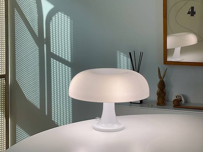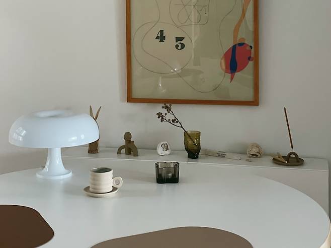그런 제 마음을 어떻게 아셨는지 비블리오떼끄에서 테이블을 구매한 후 이달의 포토제닉으로 뽑혀 선물받은 아르떼미데 네시노 조명을 요즘엔 테이블에 올려두고 사용하고 있어요. 평소에 위시리스트에 두고, 결혼선물로도 많이 했던 조명인데 직접 갖게 되어 행복했어요. 밝고 예쁜 조명이에요.