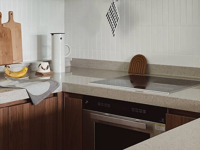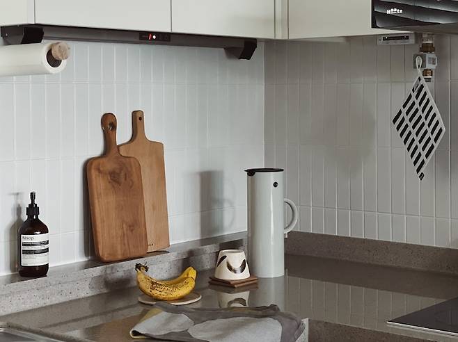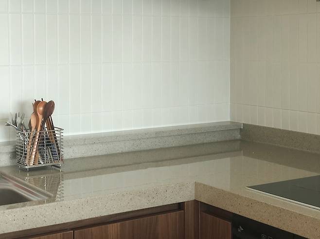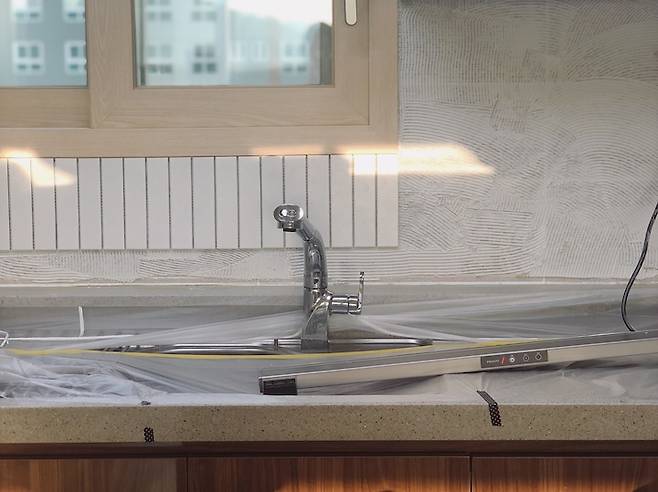 입주 당시 주방의 그레이 타일이 주방을 더 어둡게 보이게 하는 것 같아 화이트 컬러의 타일을 덧방 시공하여 분위기를 살짝 바꿔 보았어요.