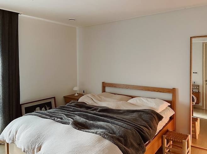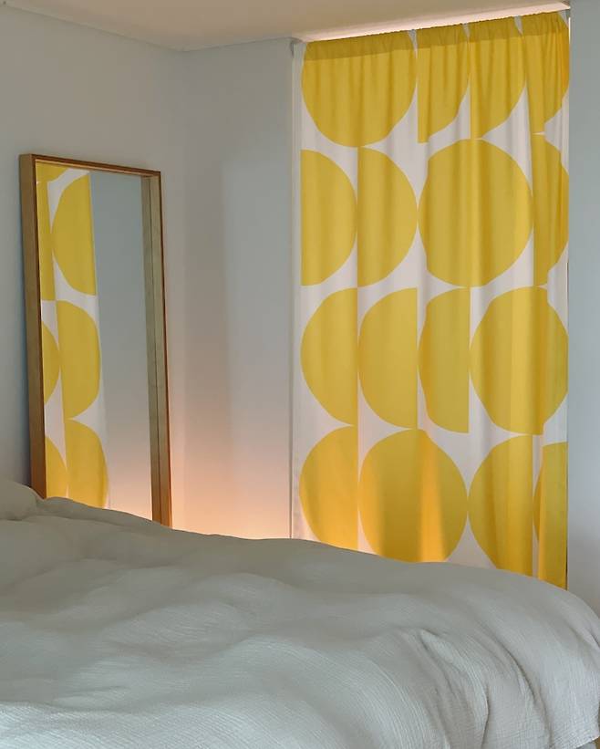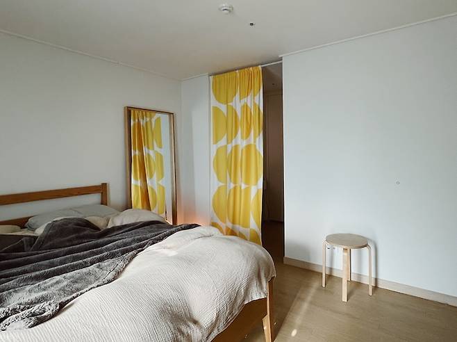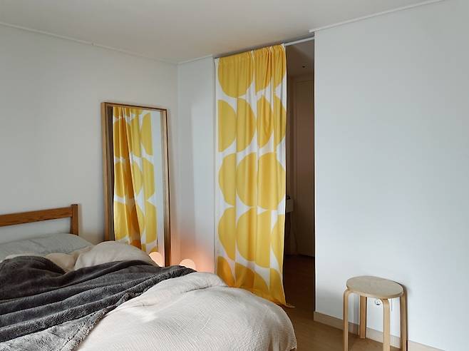 커튼 뒤로는 파우더룸과 욕실, 그 안쪽에는 드레스룸이 위치해 있습니다. 제가 화장대에 물건을 늘여 놓고 쓰는 편이라 너저분한 것들이 바로 보이는 게 싫어서 커튼을 설치하여 공간 분리를 하였습니다. 노란색 커튼으로 포인트를 줬더니 따뜻하고 아늑해보여요. 요즘은 날씨가 쌀쌀해져 두꺼운 블랭킷을 꺼내놓았어요.