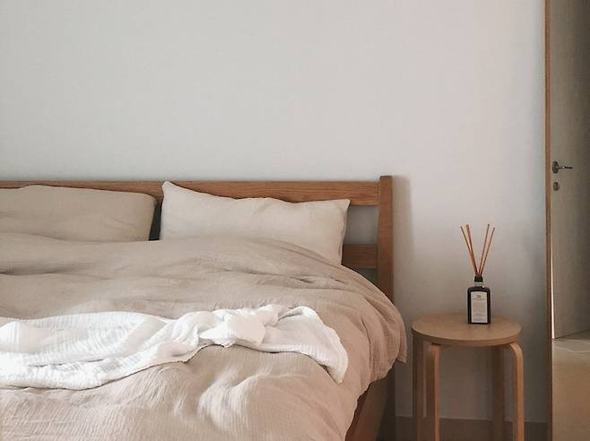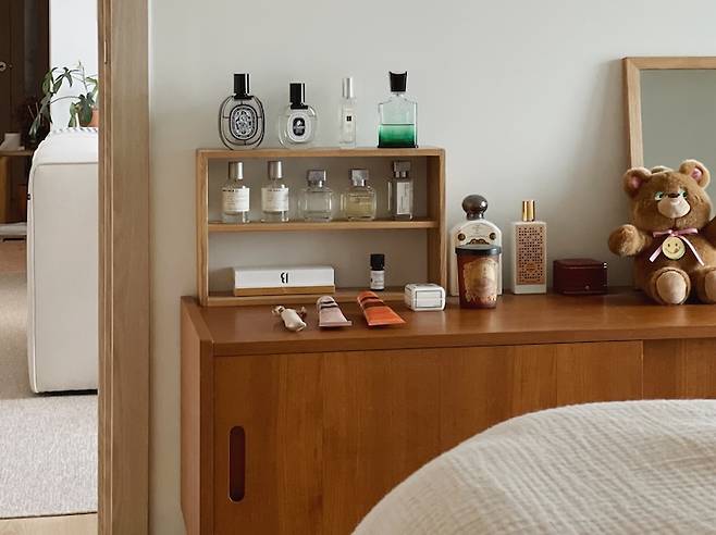 거실장은 세리프 티비를 들이면서 지금은 안방으로 옮겨왔어요. 침실에 있는 가구 대부분은 신혼 때 샀던 제품들이에요. 무난한 나무 컬러이기 때문에 질리지 않고 여전히 잘 사용하고 있답니다. 침실이 큰편이 아닌데 공간을 많이 차지하는 것 같아 거실장을 버리려고 했었는데, 아직도 튼튼해서 출근이나 외출 준비를 마치고 남편과 제가 향수를 올려두고 뿌리기 좋은 위치에서 잘 사용하고 있어요.