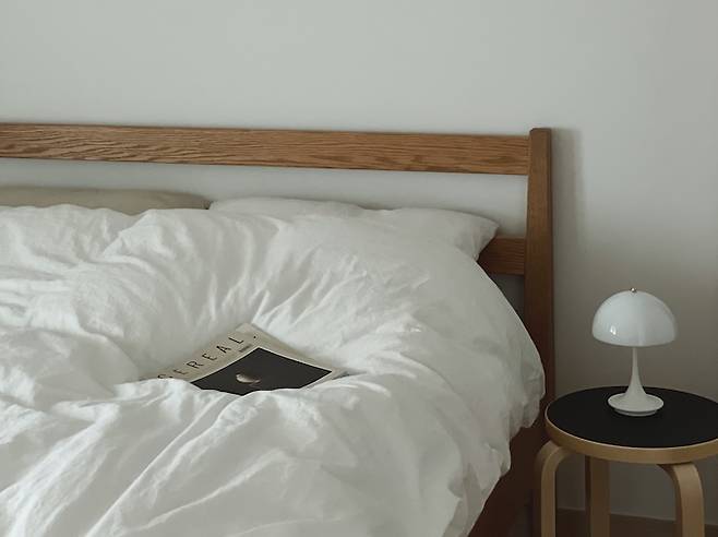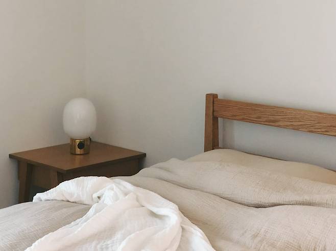 침실은 잠이 편안하게 들 수 있는 환경을 만들고 싶어 항상 간결하게 유지하고 있어요. 침대는 옮기기가 힘들어 위치가 바뀌진 않지만 작은 가구나 소품들의 위치를 조금씩 바꿔가면서 분위기에 변화를 줍니다. 메누의 조명은 스위치를 돌리면 밝기조절이 되는 제품이라 다양한 밝기로 사용 가능해서 좋아요.