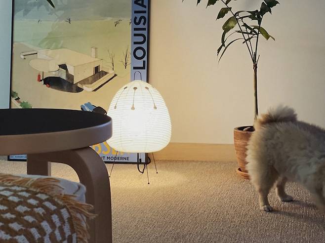 블랙컬러의 가구들과 맞추고 싶어 블랙 프레임으로 된 포스터를 구입했어요. 집이 대부분 베이지톤으로 컬러감이 약해서 블루 컬러가 들어간 그림으로 골랐어요. 비트라의 이사무노구치 조명은 직구로 구입했던 제품이에요. 집이나 작업실에서 사용하고 있는 대부분의 조명은 선물 받은 것을 제외하고 모두 네스트 사이트에서 직구로 구입했습니다. 세일 기간을 이용하면 국내 판매 가격보다 좀 더 착한 가격으로 구입할 수 있어요.