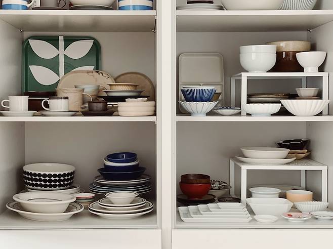 주방 옆 팬트리는 그릇장으로 쓰고 있어요. 조금씩 야금야금 사다보니 두서 없이 다양한 브랜드의 그릇들이 많아요. 도예 작가의 그릇부터 빈티지, 여행에서 사온 것 등등. 요즘 당근마켓으로 안 쓰는 그릇들을 조금씩 처분하고 있는 중이에요. 최근에 잘 쓰는 그릇은 턱스톤 제품인데 튼튼하고 전자레인지 사용도 편해서 막 쓰기에 좋아요.