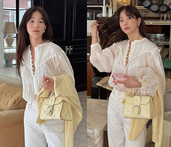 기은세는 러플 디테일이 돋보이는 시스루 셔츠에 하이웨이스트 화이트 데님 팬츠를 매치해 청량하면서도 우아한 무드를 완성했습니다.