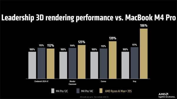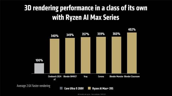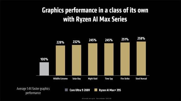 외장 그래픽에 준하는 그래픽 코어가 결합된 덕에 라이젠 AI 맥스 시리즈의 플래그십 모델인 라이젠 AI Max+ 395의 성능은 코어 울트라 9 288V 대비 3D 렌더링에서 최대 402%, 그래픽(게임) 분야에서는 최대 258%, M4 프로 12코어 맥북 모델과 비교한 3D 랜더링 성능은 최대 186%에 달하는 것으로 소개되었다.