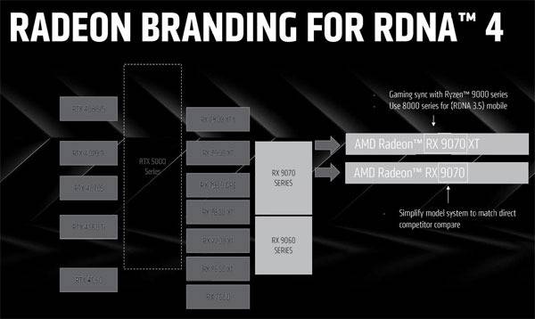 기존과 다른 네이밍 적용에 대해서는 경쟁 제품과 직접적인 비교를 쉽게하기 위함이라고 알렸는데, 이에 따르면 라데온 RX 9070 XT는 지포스 RTX 4070 Ti, RX 9070은 RTX 4070과 경쟁하며, 라데온 RX 9060 시리즈는 RTX 4060 Ti를 포함한 RTX 4060 시리즈와 경쟁한다.