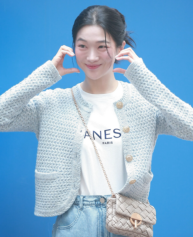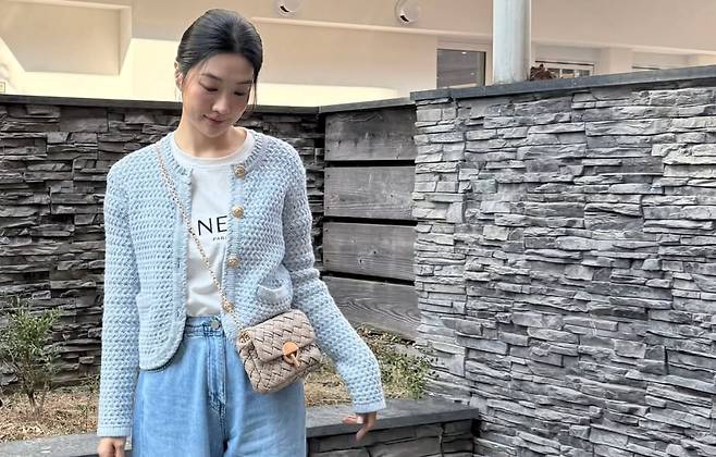 최근 공개된 사진에서 정윤하는 밝은 블루 계열의 케이블 니트 가디건과 라이트 워싱 와이드 데님 팬츠를 매치한 캐주얼한 스타일로 등장했다.