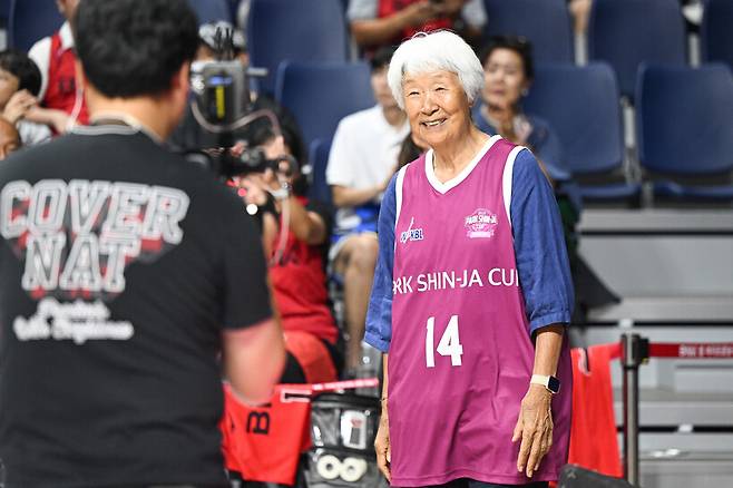 지난 2015년 첫 대회 개막전 이후 10년 만에 농구공도 잡았다. 다시 한번 개막전 시투에 나섰고, 어렵지 않게 첫 시도에 성공했다. 농구화를 신은 박신자 여사의 모습도 볼 수 있었다. 상의와 같은 색깔의 분홍색 농구화. 다름 아닌 '친조카' 박정은 감독, 한상진 배우의 깜짝선물이었다.