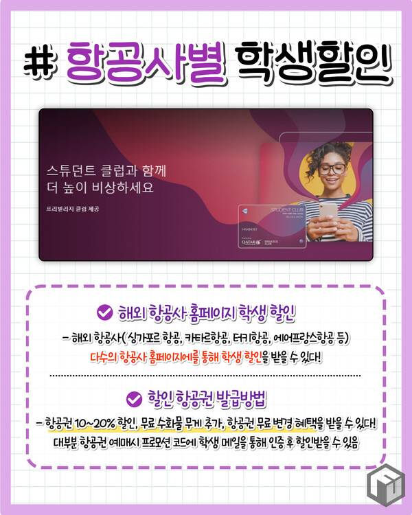 항공권 가격의 10~20%를 할인 받을 수 있으며 무료 수화물 무게 추가, 항공권 변경시 무료로 변경할 수 있는 다양한 혜택이있습니다. 이용 방법으로는 항공권 예매시 프로모션 코드에 학생메일을 남기거나, 학생 인증을 통해 할인 받을 수 있습니다.